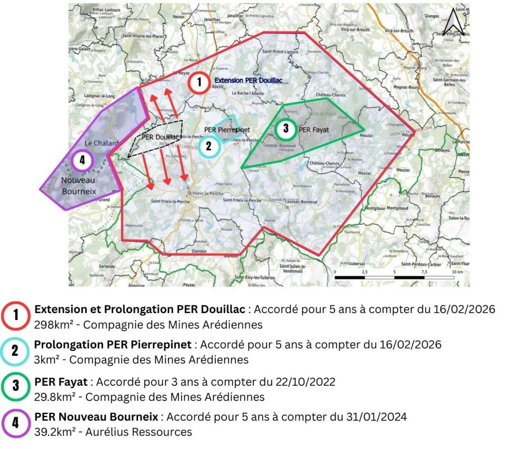 La Compagnie des Mines Arédiennes a déposé une demande d’extension du PER Douillac portant la superficie totale de 7,11 km² à 297,98 km². Par cette extension, neuf nouvelles communes seront intégrées au PER Douillac (Château-Chervix, Coussac-Bonneval, Glandon, La Meyze, La Roche-l’Abeille, Meuzac, Ladignac-le-Long et Saint-Priest-Ligoure en Haute-Vienne et Jumilhac-le-Grand en Dordogne) s’ajoutant aux deux communes initiales du Chalard et de Saint-Yrieix-le Perche.